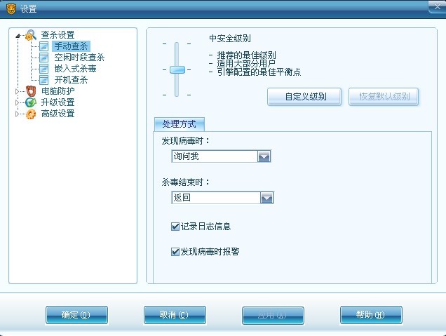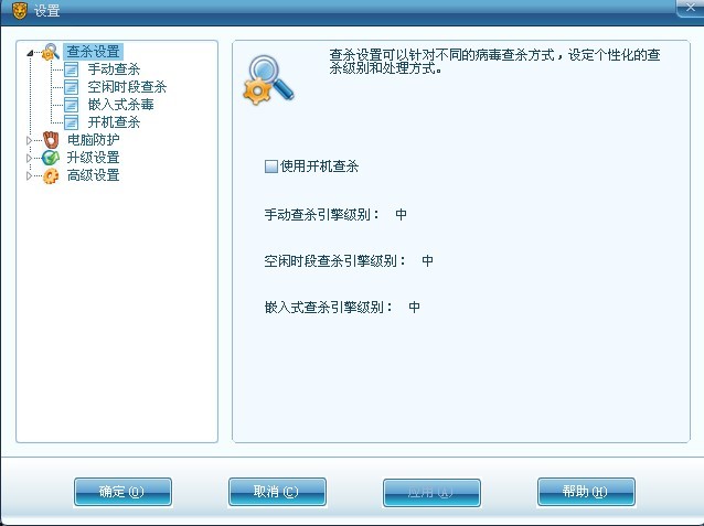 看!主界面很清楚的现实当前的各种查杀状态 让你个性设置的同时心中有数了下面分看每一项设置(一)、查杀设置包括【手动查杀】【空闲时段查杀】【潜入杀毒】【开机查杀】