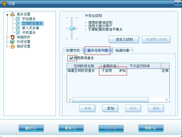 这里你可以 选择是否使用屏保查杀,可以鼠标点击启用状态栏里的任务 然后点击修改 进行个人设置 下图