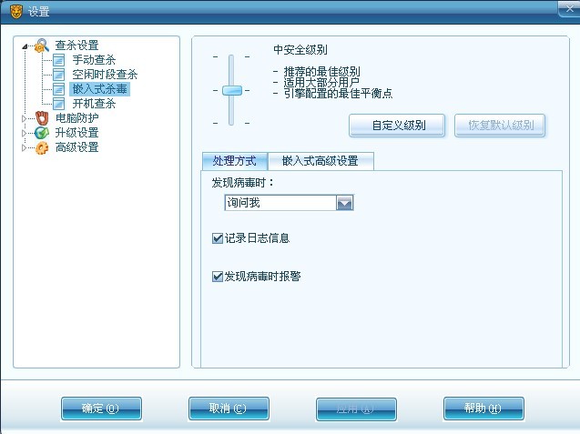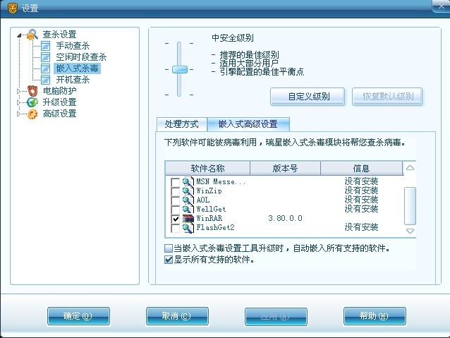 这是你会生问 09版的设置嵌入杀毒文件还可以在查杀设置总界面看 10在哪里? 对完全集中到【嵌入杀毒设置】里了