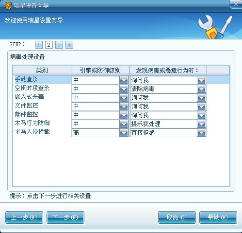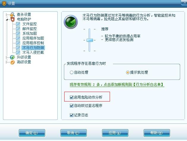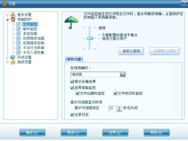 发现什么了么?对 处理方式这里 少了清除失败时 和 隔离失败时 这两项 而且仅发现病毒时的处理方式也少了只有(不处理)(清除病毒)(询问)三项了 是不是不再为 以前版本 出现各种设置不知道该怎么设置更好而苦恼呢?