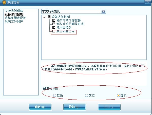 通过瑞星的帮助材料查到的安全磁盘访问通过禁止explorer.exe 访问U盘下的autorun.inf 可防止U盘自动启动病毒进程。您可以在系统加固设置页面中通过勾选【安全磁盘访问】的复选框,实现对磁盘访问进行保护与控制的功能。