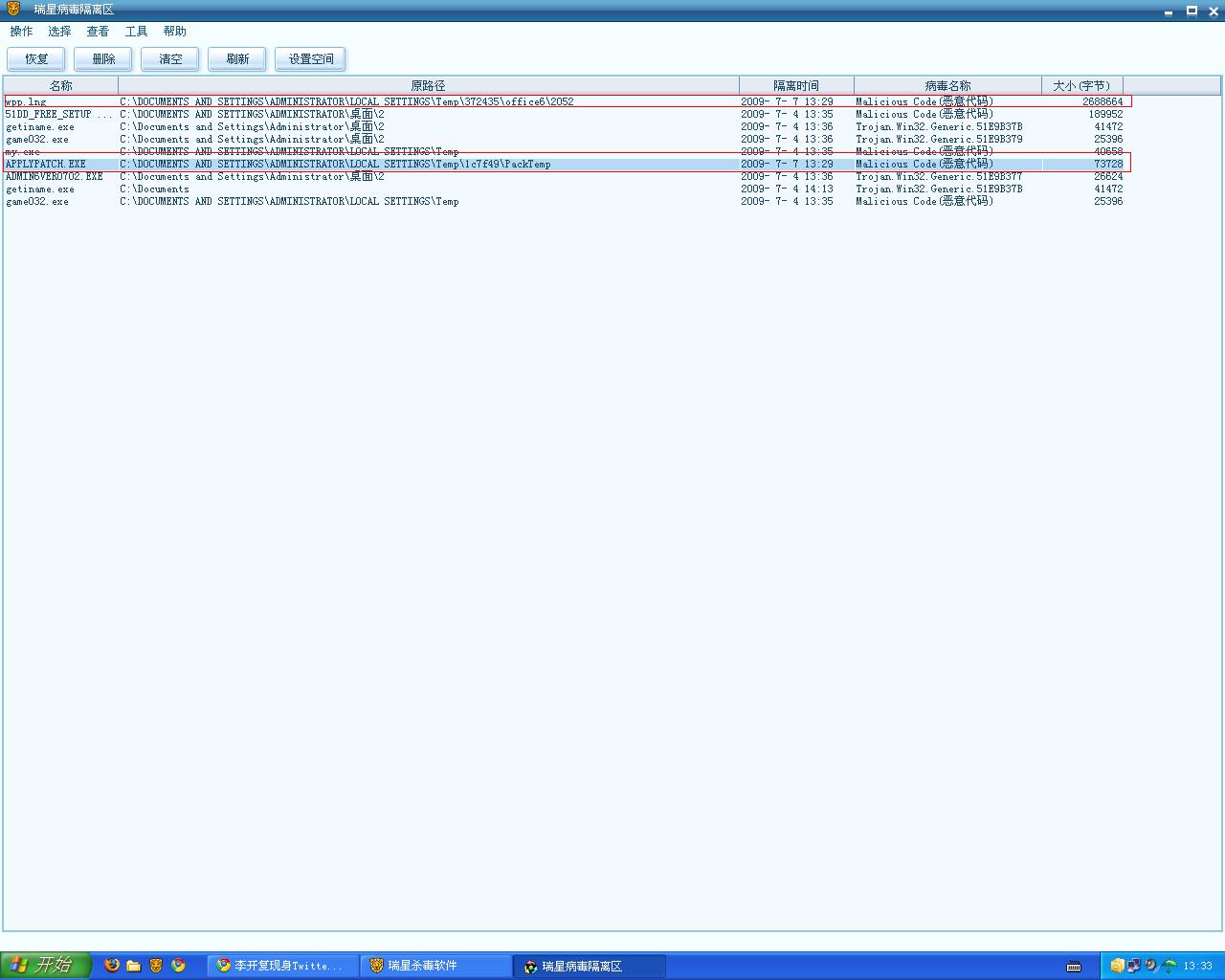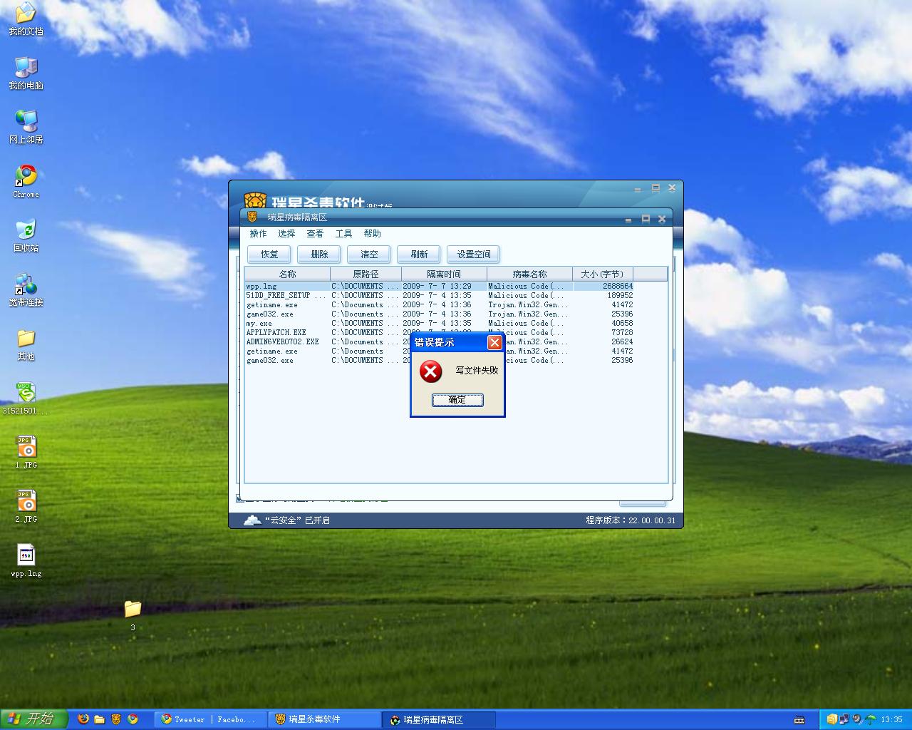 在恢复隔离区wpp.lng时瑞星报错了。