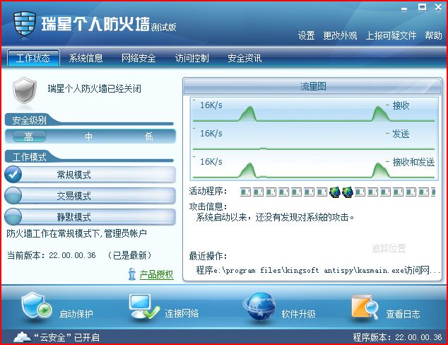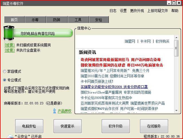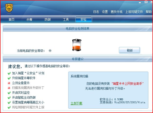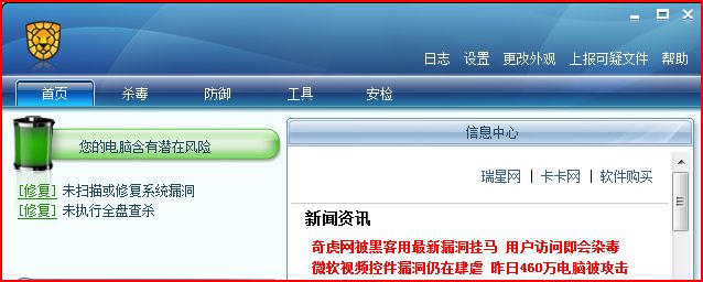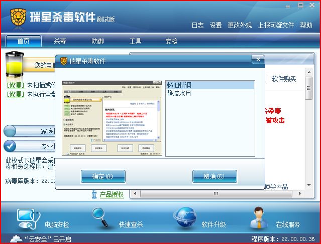 下安装好瑞星后发现了又新的皮肤,切换了一下!在原本黄色警告显示的安检,变成了绿色!