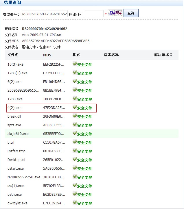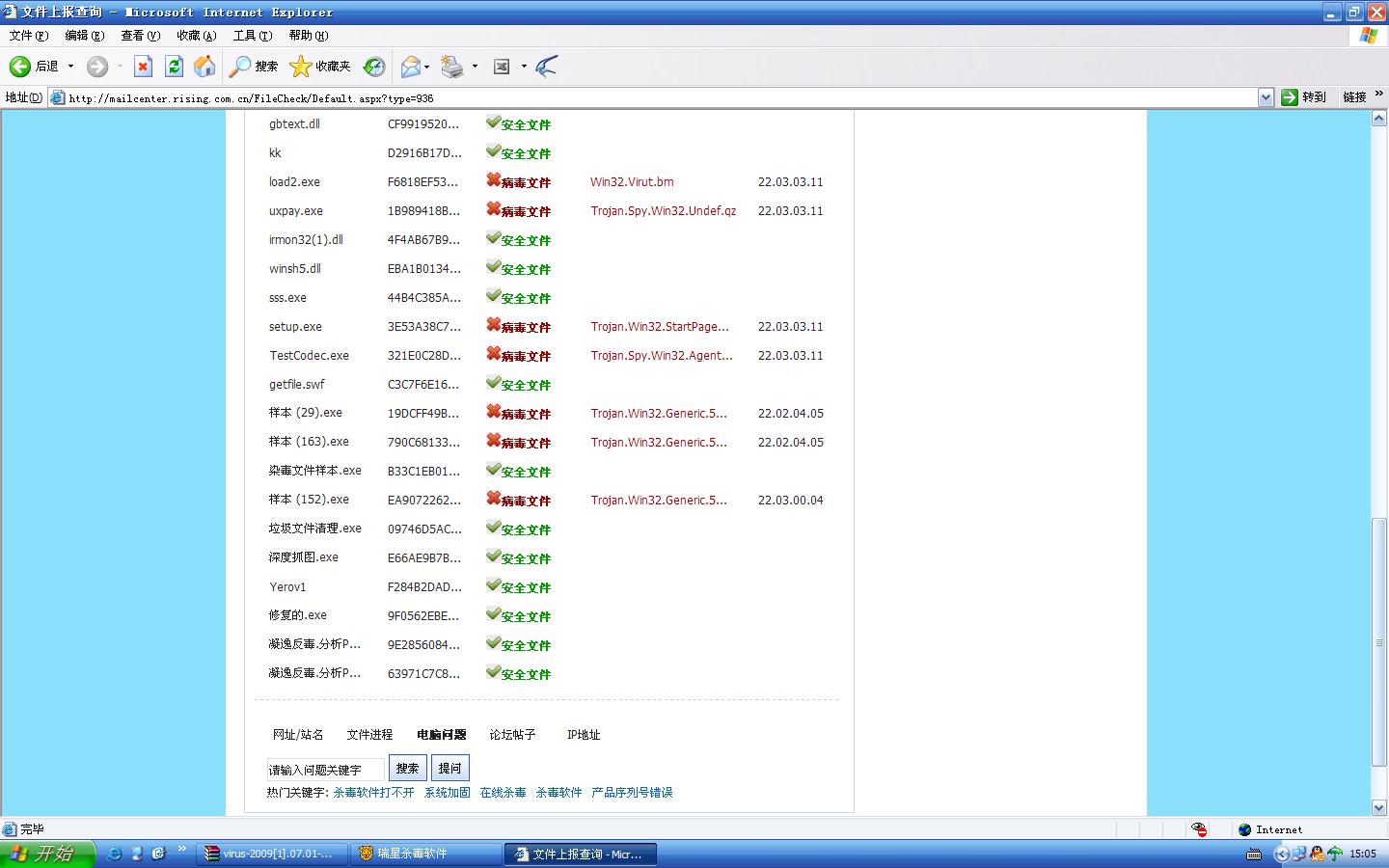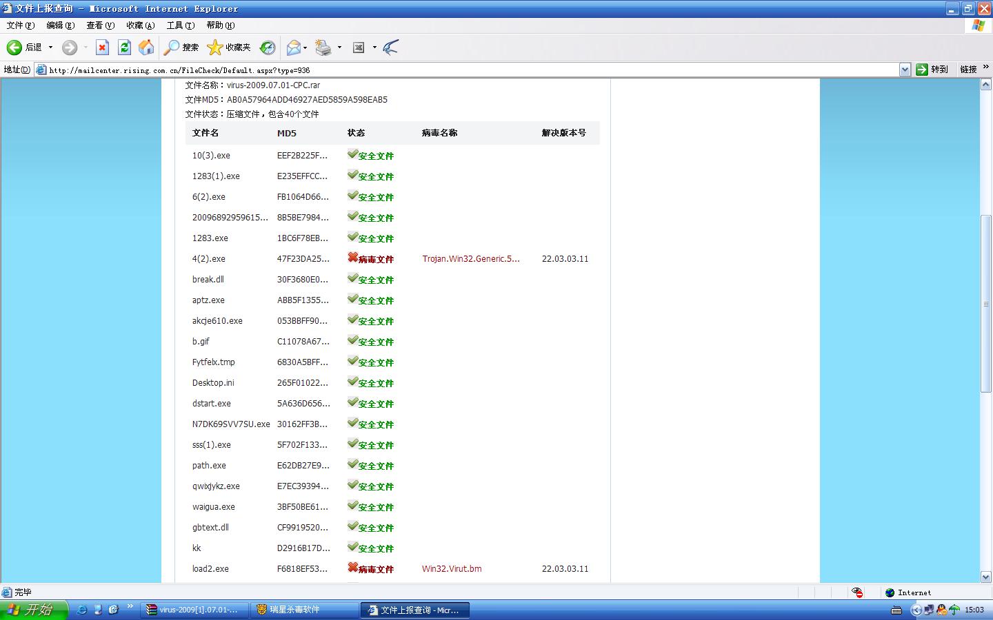 7月9日,我又上报了2009年7月的最新病毒样本文件包,来测试2010查杀未知病毒的能力。还是老办法,先用2010查杀掉能识别且能清除的病毒,然后把2010当时版本未报毒而我确知仍含有病毒的剩余样本文件(共40个)上报。我在14:06分以后上报,在15:03就查询到40个文件的分析结果。分析结果见图一的截屏: