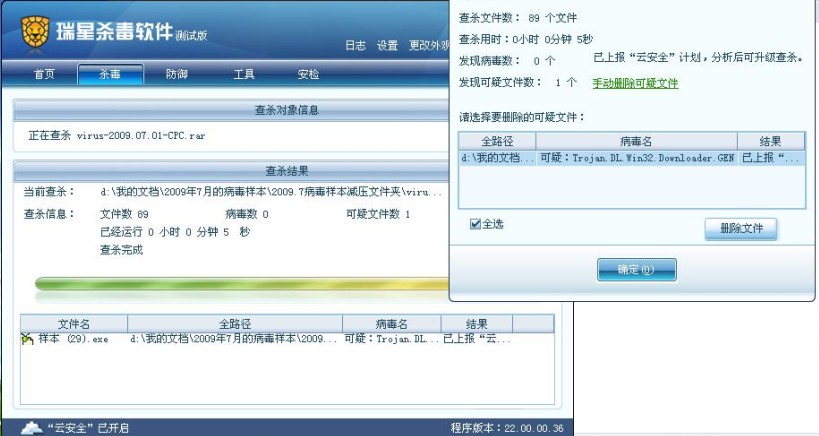 到此为止,瑞星分析诊断到的8个病毒用2010查到3个(暂时把这次查杀到的样本文件:样本(29).exe中的病毒看作与瑞星云安全分析到的病毒为同一病毒计算),杀掉其中两个,其中手动清除样本(29).exe中的病毒后,杀毒结果显示删除成功,可再次查杀又查杀到了,仍是已上报“云”。信息显示前后矛盾。