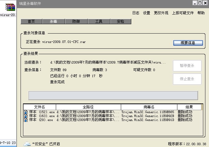 随着杀软的升级,我把杀软升级到22.00.00.38,再来查杀,结果又查杀掉三个病毒文件中的病毒,包括上面提到的清除不掉的病毒文件:样本(29).exe