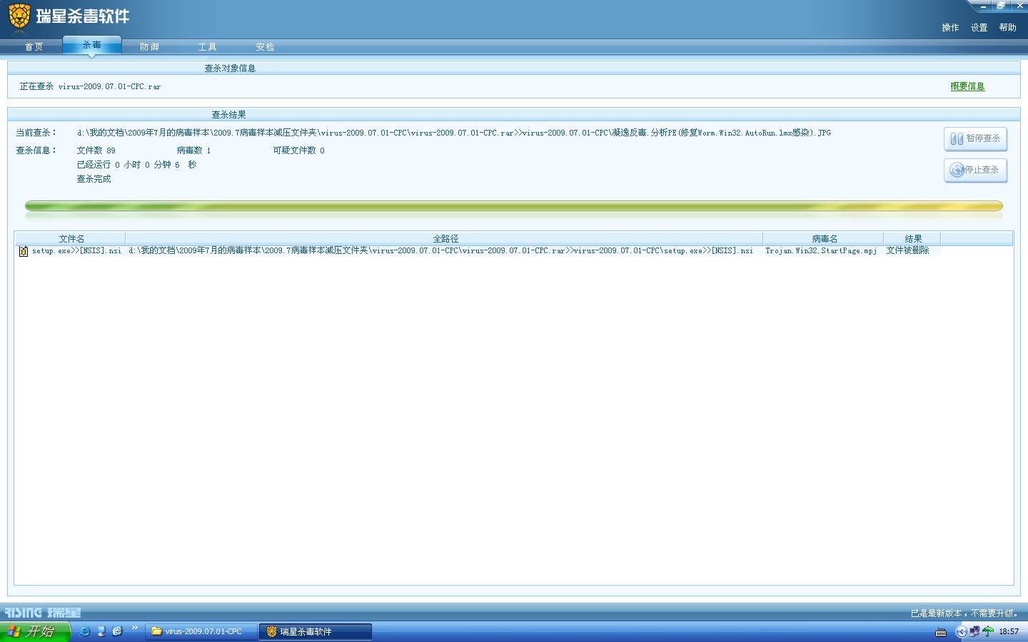 到此为止,用2010共查杀清除掉瑞星云安全分析出的8个病毒文件中的5个病毒,还有3个病毒查杀不到。不解之余,我突然想到用瑞星2009来查杀,看能否查杀掉。于是,我在7月14日重装瑞星2009并升级到最新版来全盘查杀。结果查杀到3个病毒。瑞星2009版本及查杀结果见图五的截屏: