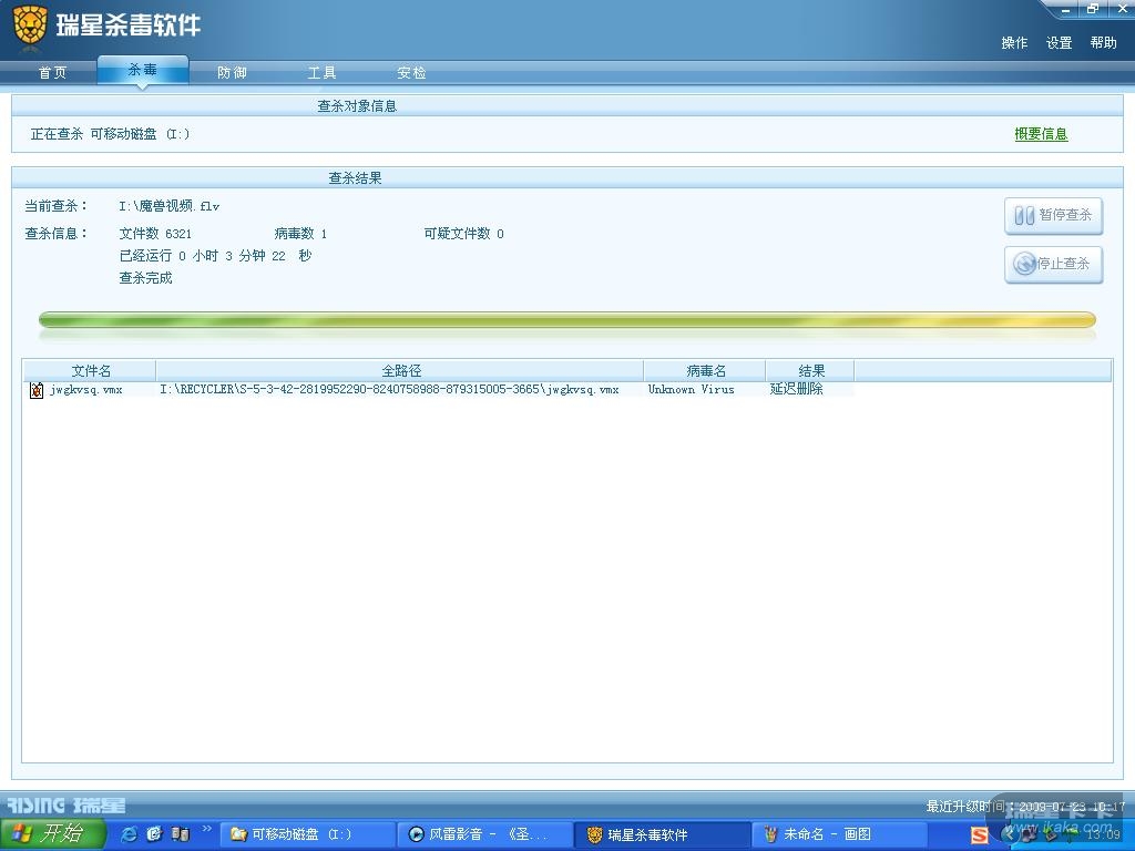 再有就是我中的这个病毒卡巴上叫net-worm.kido.h,一开始查出来过,后来查不出来了。我后来换用卡巴跟nod32(用的不是正版的)还有瑞星2009都没查出来,我也有点怀疑是不是真没有病毒了。但是前几天我把U盘xxx同学一装江民的笔记本上,竟然一插上提示删除一个蠕虫病毒,名字又是另一个名字,跟卡巴的那个不一样。(我绝对没有给江民做广告的意思)