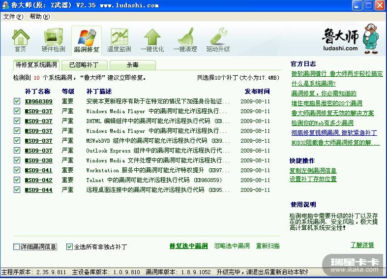 z武器(现在叫鲁大师)打补丁不会遗漏速度也非常快,可能人家在下载补丁文件的时候是采用类似迅雷的技术,比