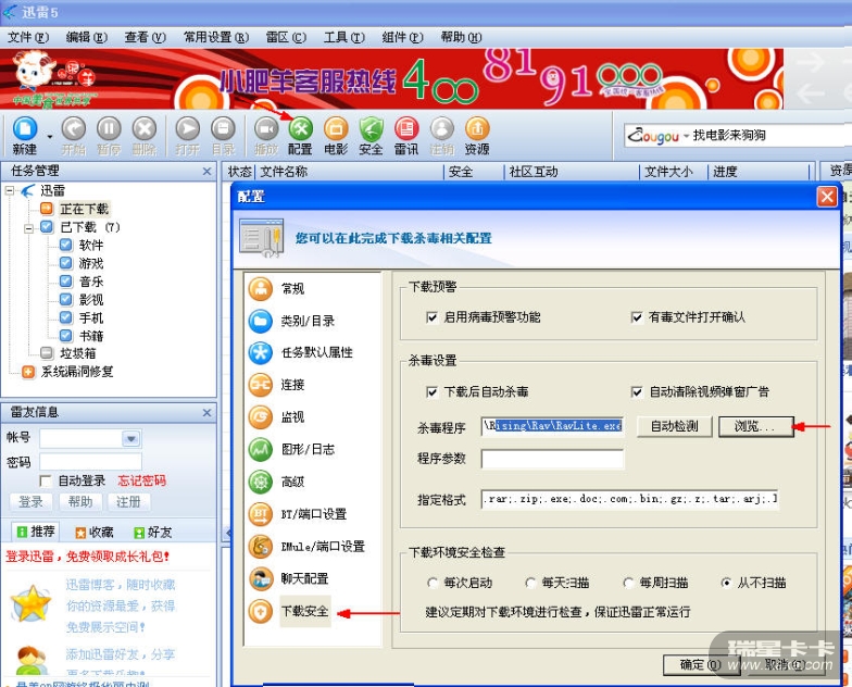 迅雷里面有个下载安全设置,可以吧迅雷和杀毒软件关联起来,下载完后自动杀毒,可以很好的保护不被病毒入侵。可是瑞星全功能安全软件就关联不起来。用迅雷找不到杀毒软件,但是单独的瑞星杀毒可以
