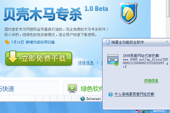 结果,瑞星一生气,就弹出了一个恶意网址拦截。哈哈。
