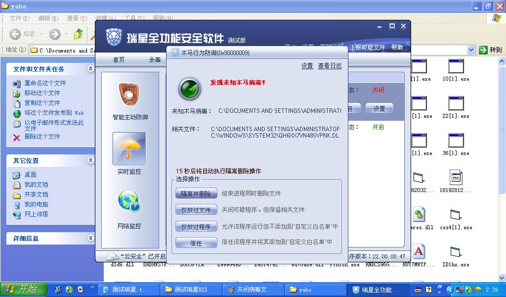 以本次测试采用关闭病毒监控的方式测试瑞星的木马行为判断: