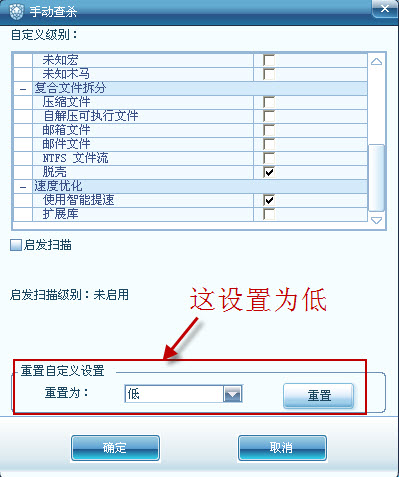 也可以通过这里直接设置,选到合适的位置然后确定,把所有有级别设定的地方都改为低设置。然后开始杀毒。