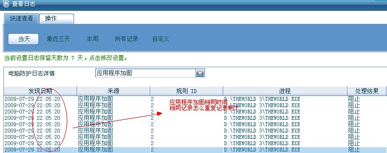 瑞星工程师测试的时候可以将世界之窗加入应用程序加固里面,然后运行世界之窗,查看日志应该就能看到重复记录了