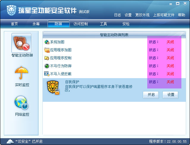 正常情况下,首页至少会显示。部分监控没有开启、没有全盘查杀、没有开启智能主动防御。
