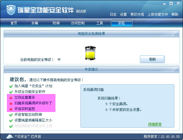 上面会列出瑞星检测到的可能引起系统不安全的因素,可以称作温馨提示吧。
