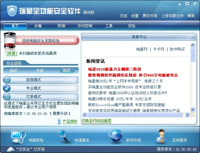 以前瑞星有一个非常人性化的地方,就是在需要升级的时候会在病毒库版本号的右边显示“需要升级”