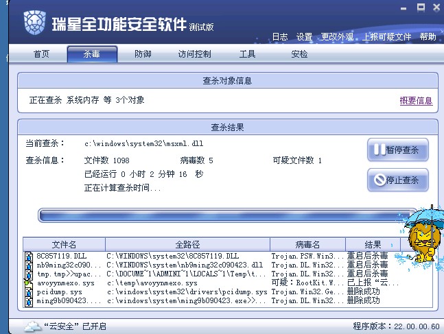 当有DLL成功注入了系统中的系统进程和普通应用程序进程之后,再使用瑞星杀毒去查杀,有时候会提示:杀毒失败\重启后删除等.