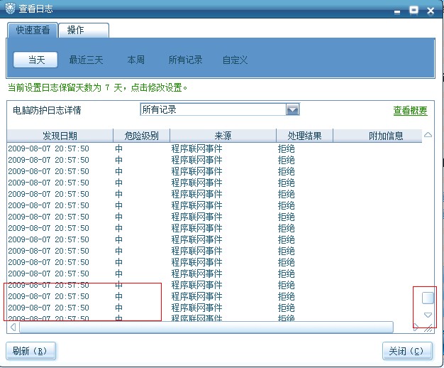 安装最新的qq音乐,酷狗音乐,千千静听都被瑞星全功能安全软件拦截,因而不能连接到网络,日志放大拉到下面后自动跳到上面,而且从拦截时间上看没有拉动,还是在原来的位置下图所示: