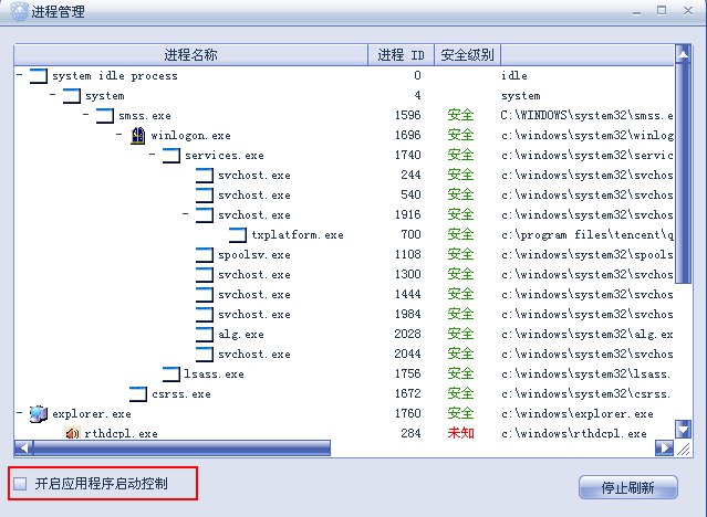 应用程序启动控制是通过进程管理来监视进程的创建。通过云安全系统分析病毒创建的进程,然后下载到用户的计算机上。启用应用程序启动控制后,一旦发现病毒的进程立即阻止,使得病毒进程无法创建,更无法对计算机造成破坏。这样,使得原本木马入侵拦截,木马行为防御的防御体系更加稳固。