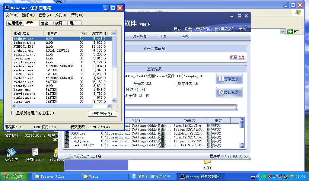 详实的数据,一样的硬件环境,可以看出瑞星RIS2010在低配置的上网本中的查杀时资源消耗依旧是惊人的(CPU方面),查杀速度还是比较缓慢的。在相同的病毒包中检出率和avast!尚存差距。