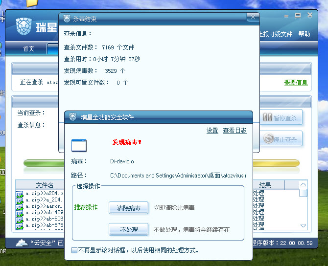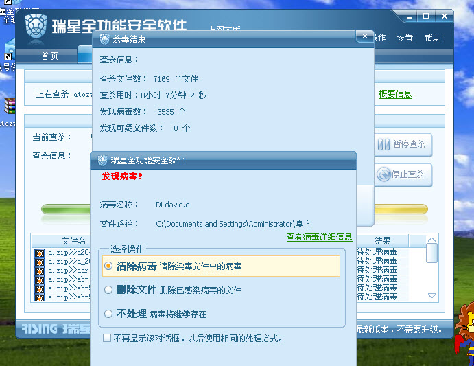 (这个是瑞星全功能安全软件----上网本版的查杀,清除病毒的情况.右下角的对话框,可以在选择清除病毒,立即显示出来。而无须关闭软件主界面,才能显示。)