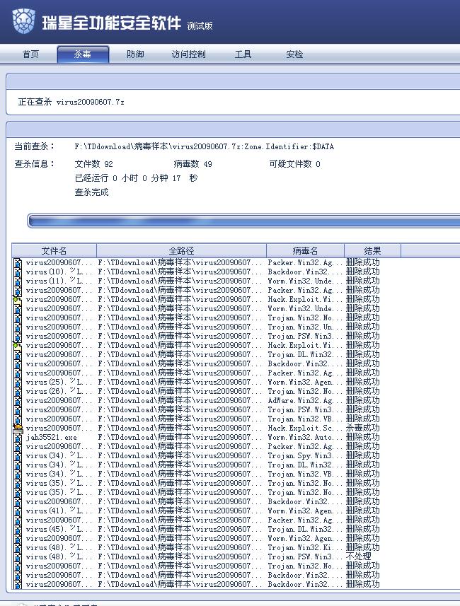 第二个病毒包,精选2009年6月份的病毒,内有文件92个,其中病毒50个,RIS2010表现不错,查出并杀掉了49个