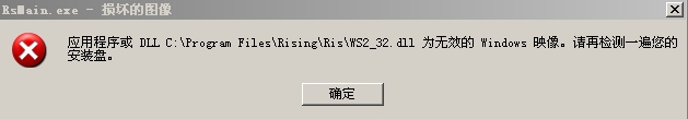 1、关闭瑞星保护,建立文件ws2_32.dll,运行RSMAIN.EXE瑞星主程序,虽然启动时报ws2_32.dll为无效的windows映像,但程序正常启动了,而且不影响病毒的查杀。开机后虽然报错,但是监控等能正常运行。