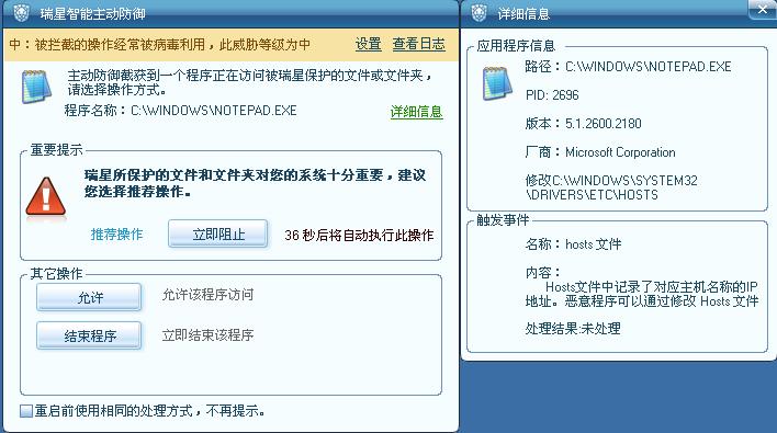 例如对hosts文件修改时,瑞星防御会予以报警