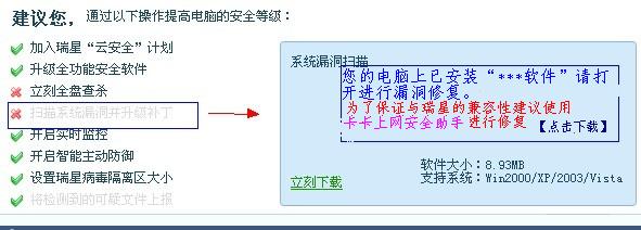 大家有的未必安装卡卡 这样这一项始终为灰色 为了满足大众需要 何不安装了任何一款类似软件 就可以提示安装了? 就像金山清理专家一样 无论你按任何一款杀毒软件 评分系统都会显示的