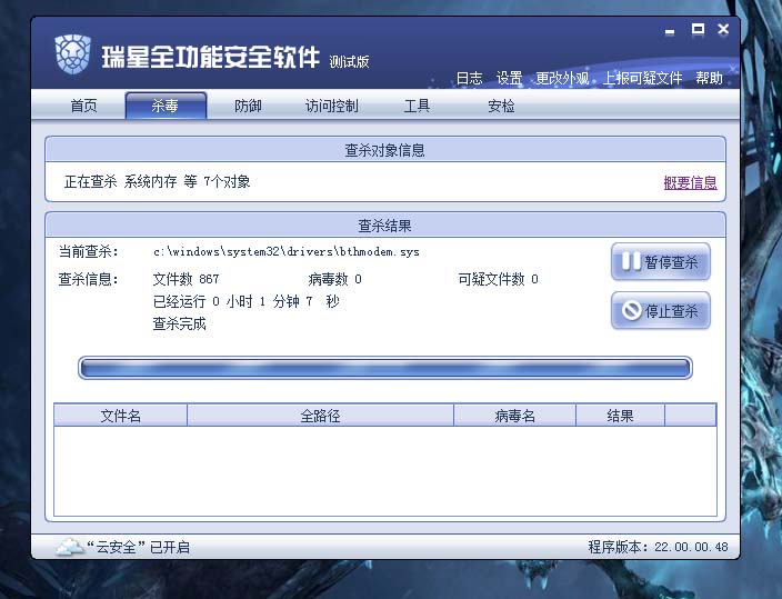杀毒出现假死状态,刚开始杀毒进度条却满了,并且不能暂停和停止杀毒.右上角的最小化关闭键却是有效的.