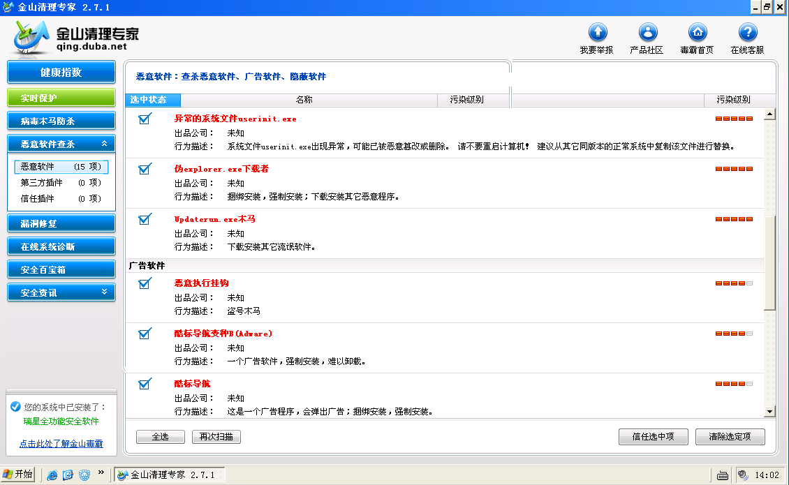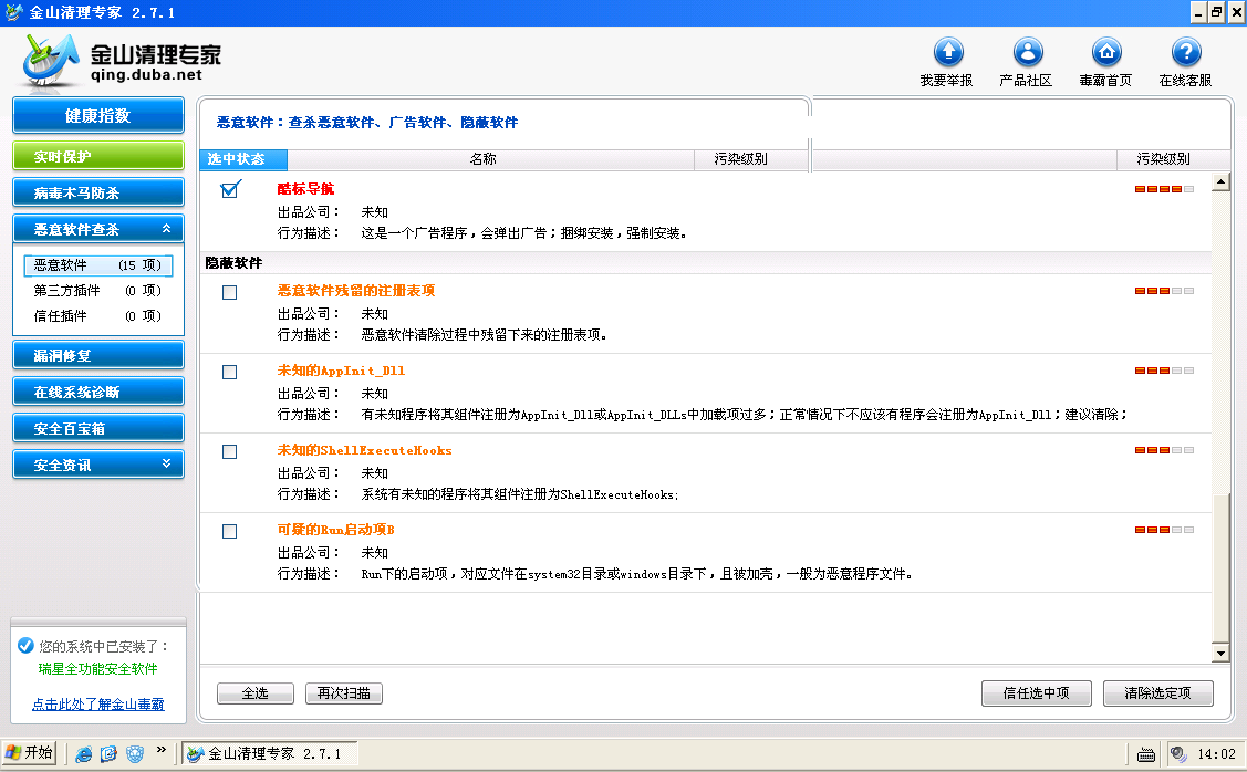 (注:其结果是瑞星修复工具处理后仍残留的)