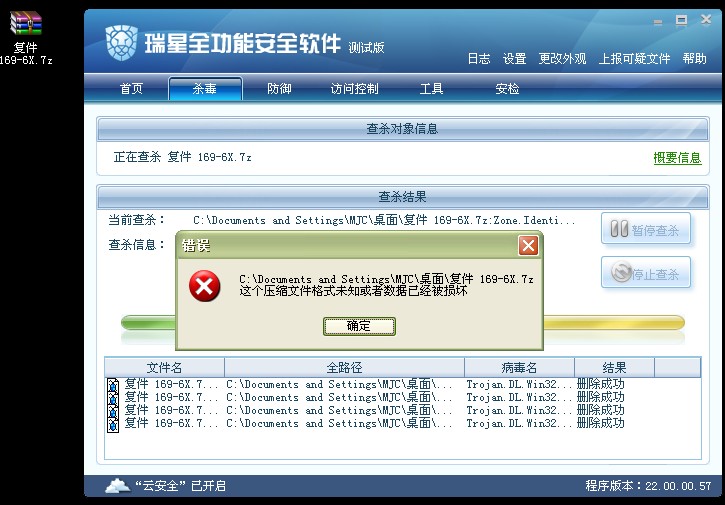 可是我这里到现在还是有这个现象,因为压缩包里有其它未知病毒,所以查杀后,压缩包没有删除,只是显示损坏。