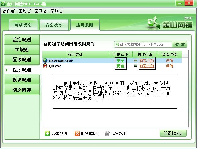 智能判断组件。对于普通用户,基本无需手动设定各个应用程序的操作权限,只要对每个模块采用默认的“智能判断”模式,即可在使用中获得安全性与易用性的良好平衡。