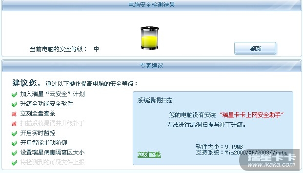 第三 安检项目中还有一项是必须要安装瑞星卡卡的,这一项有点多余,因为不同的用户有不同的使用习惯,有的人就喜欢用windows的自动更新,不能根据有没有安装卡卡而判断“扫描系统漏洞并升级补丁”这一项。