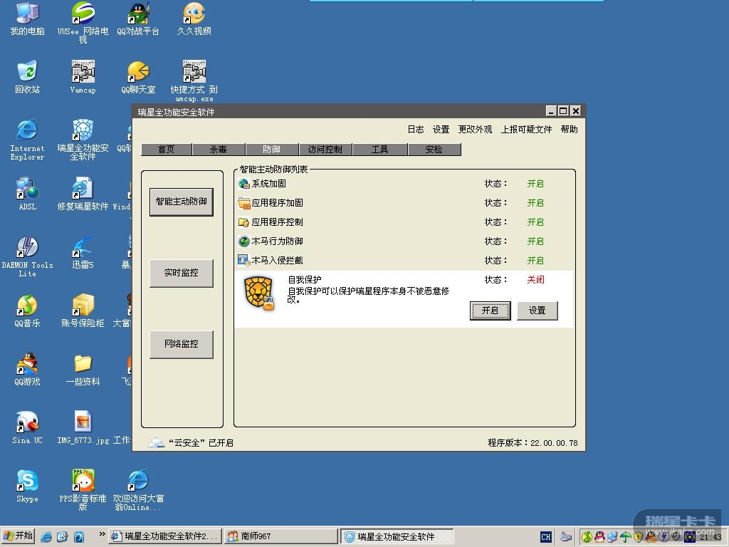 点击瑞星防御选项中的“自我保护”状态开关,选择“关闭”状态。瑞星右下角的图标没有变黄色。而选择关闭其他的瑞星防御选项,瑞星右下角的图标均变黄色