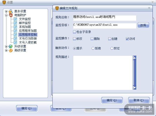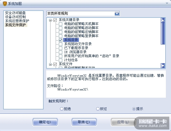 之所以做此比较,是因为与人争论一个问题:既然已经在“系统加固”中选中了“系统目录”防护,是否还有必要在“应用程序访问控制”中设置针对系统目录中某些敏感程序的防护规则。