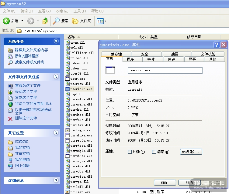 看看系统目录下的userinit.exe,已经被0.exe替换成功: