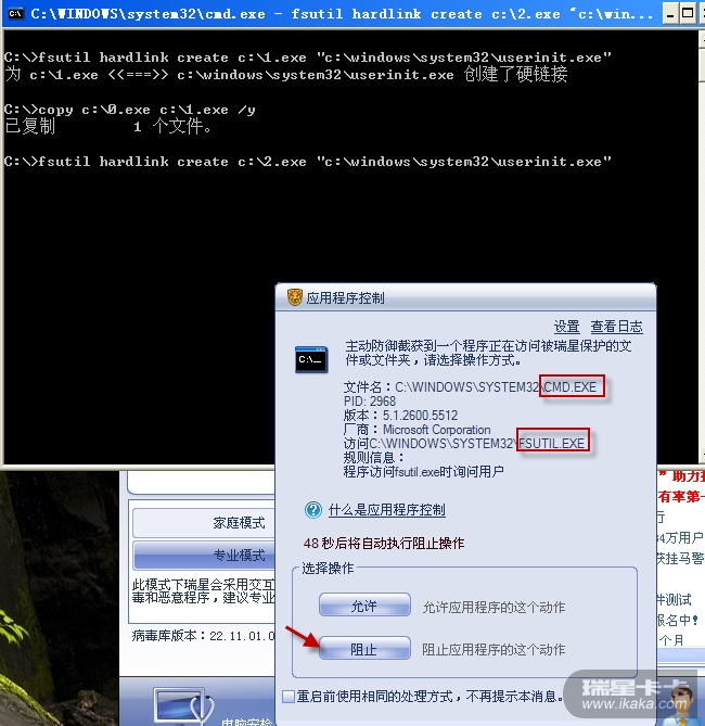 由此可见:到目前为止,“系统加固”中的“系统目录”防护默认设置并不能防止通过硬连接法替换系统文件;而“应用程序访问规则”中用户自定义的针对fsutil.exe的访问规则可以弥补系统加固这一缺陷。