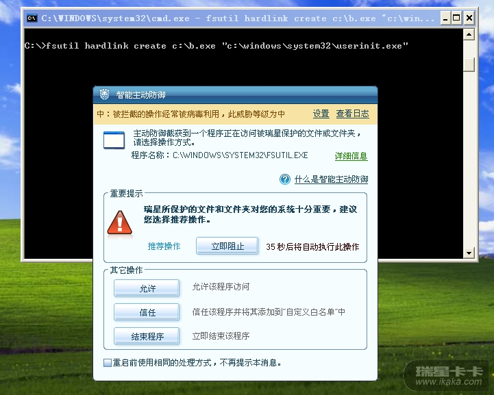 然后,看看它防止硬连接替换系统文件userinit.exe的防护效果如何: