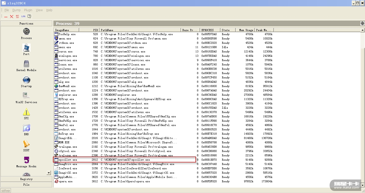 2、在看看有没有病毒进程(这个例子可以看到病毒进程;但有些病毒不一定有自己的进程,如插入其它进程运行的病毒、通过加载驱动隐藏自身进程的病毒等)。