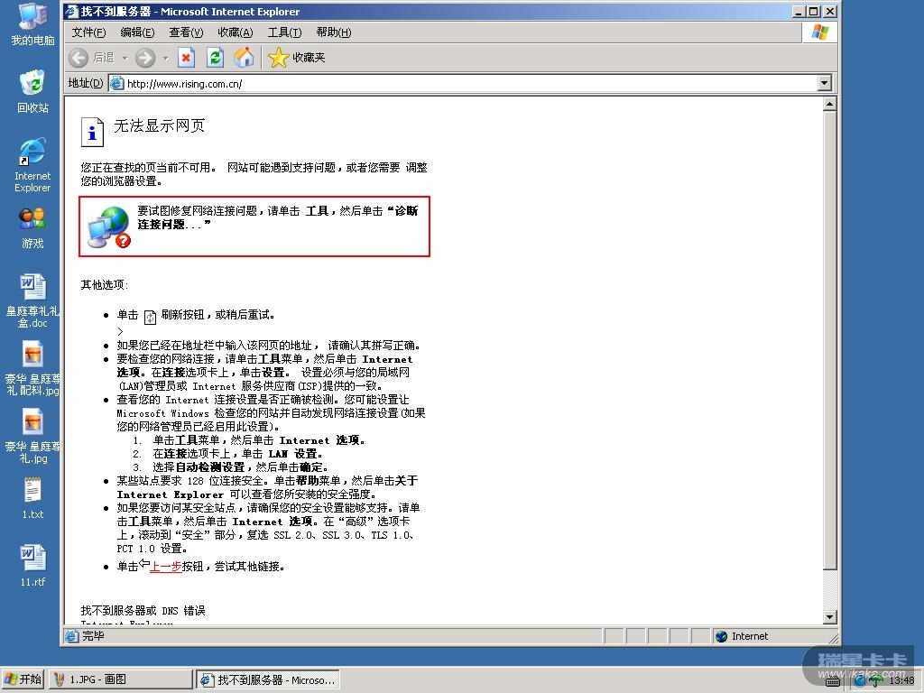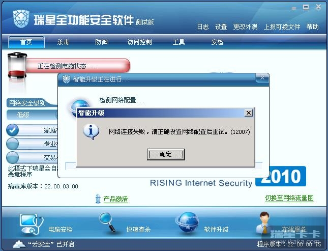 不知是什么原因,我的一台电脑无法打开瑞星网站,安装了瑞星2010版后也无法升级,(升级时显示网络配置不对),反正和瑞星有关的网页就是打不开,我从别的网站下载了卡卡助手。也不能升级。除瑞星网外其它网站均能访问。希望工程师能给予帮助。谢谢,(此电脑配置较低)
