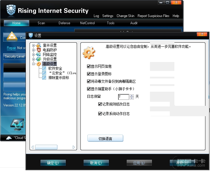收到,感谢瑞星164关注,不过我声明,这个我个人认为的瑕疵的发生是切换语言后主界面立即闪屏更换,而此时“高级设置”也应该立即改变(目的是要给出用户预览模式)然后点击应用并确定,彻底加载语言包。如果瑞星非此设计,那远程大可不必