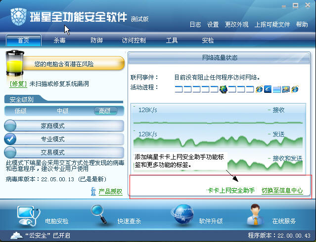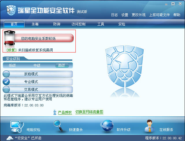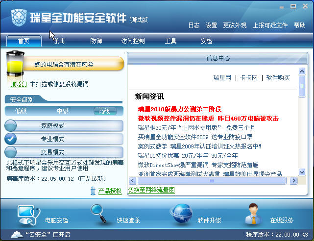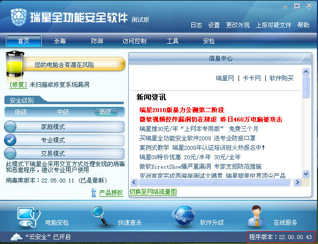 在瑞星2010版全功能安全软件的主界面的左上角中可以看到瑞星的安全提示,如图4: