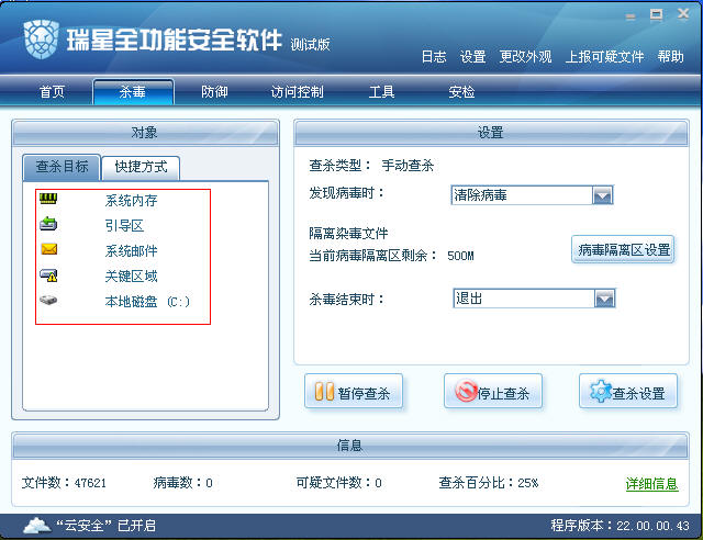 升级完成后开始对计算机进行扫描,在这里我只对C盘、系统内存、引导区、系统邮件、关键区进行了扫描。如图12: