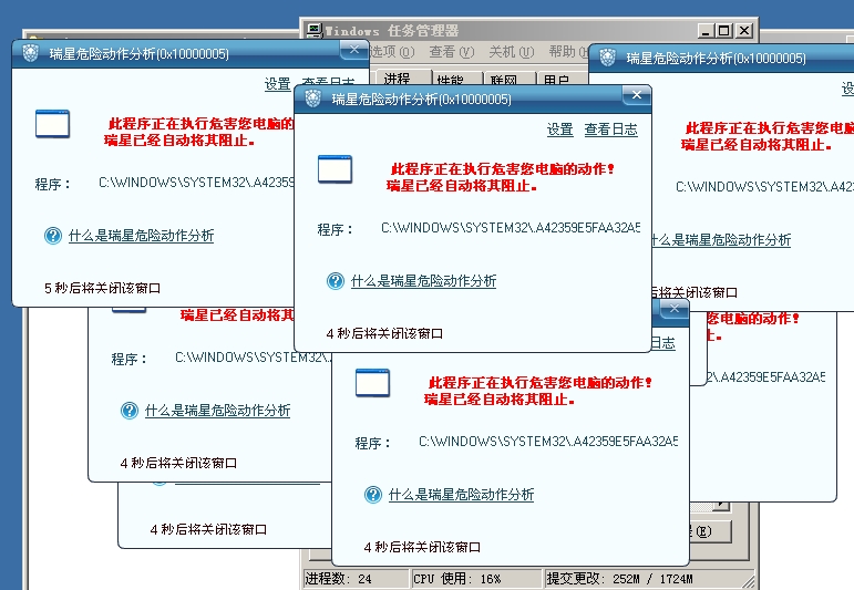 部分样本运行时,虽然瑞星防御报警,但是窗口无法通过鼠标关闭。请查。