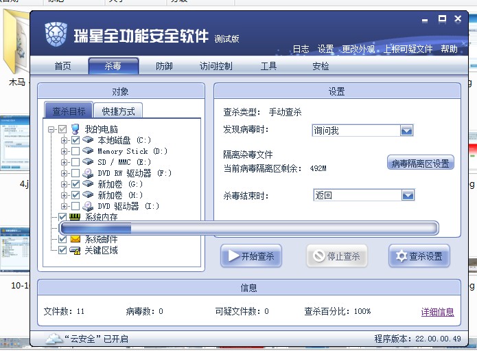 注:从调出主程序到开始扫描,这段时间确实挺长的,这是我标题所指的第二处响应时间长;至于图例所显示的查杀过程,可能是已查杀过的文件才会出现。