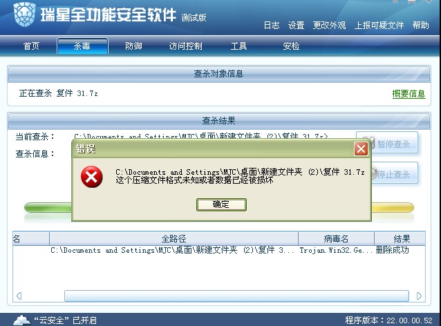 在查杀7-zip压缩文件时,如果包里有3个文件,瑞星查杀了压缩包里的一个病毒文件后,该压缩包就无法打开了,显示数据损坏。