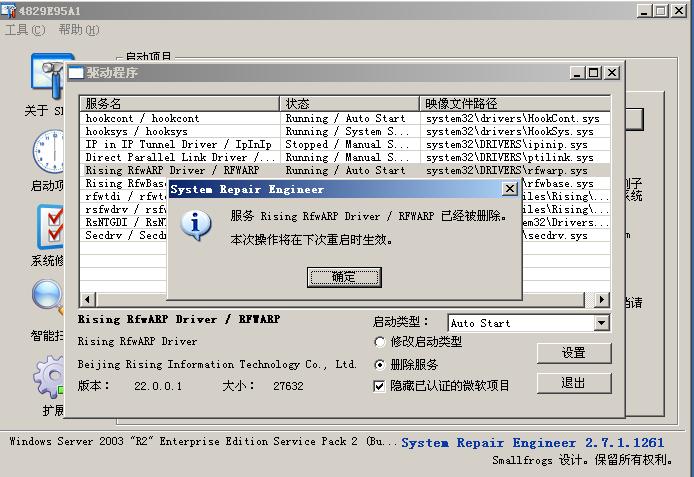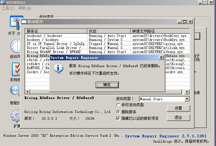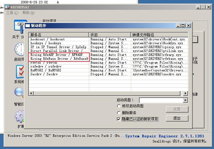 轻轻松松绕过瑞星RIS2010 的自我保护,干掉瑞星两个驱动服务