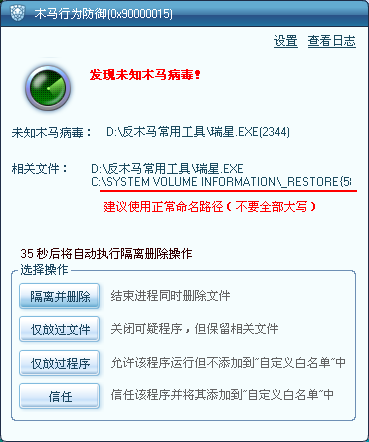 运行病毒后,瑞星弹出主动防御窗口(选择放行),瑞星弹出未知木马检测窗口(如图)。如果此时再次放行,瑞星立刻被病毒杀死!
